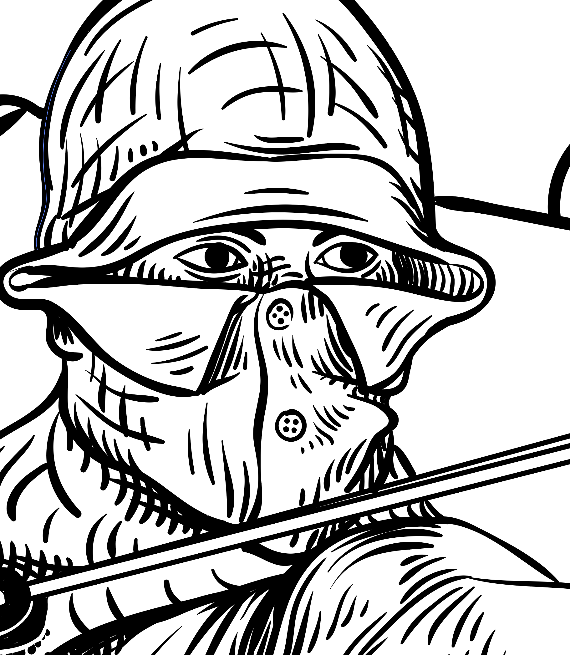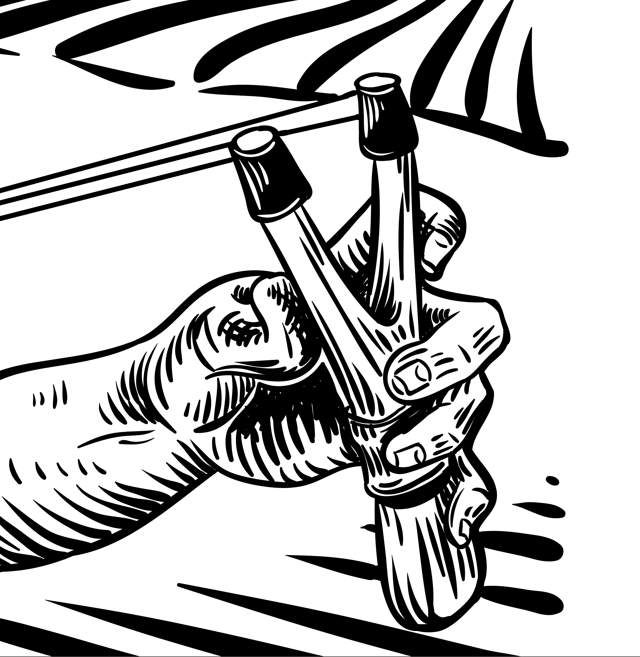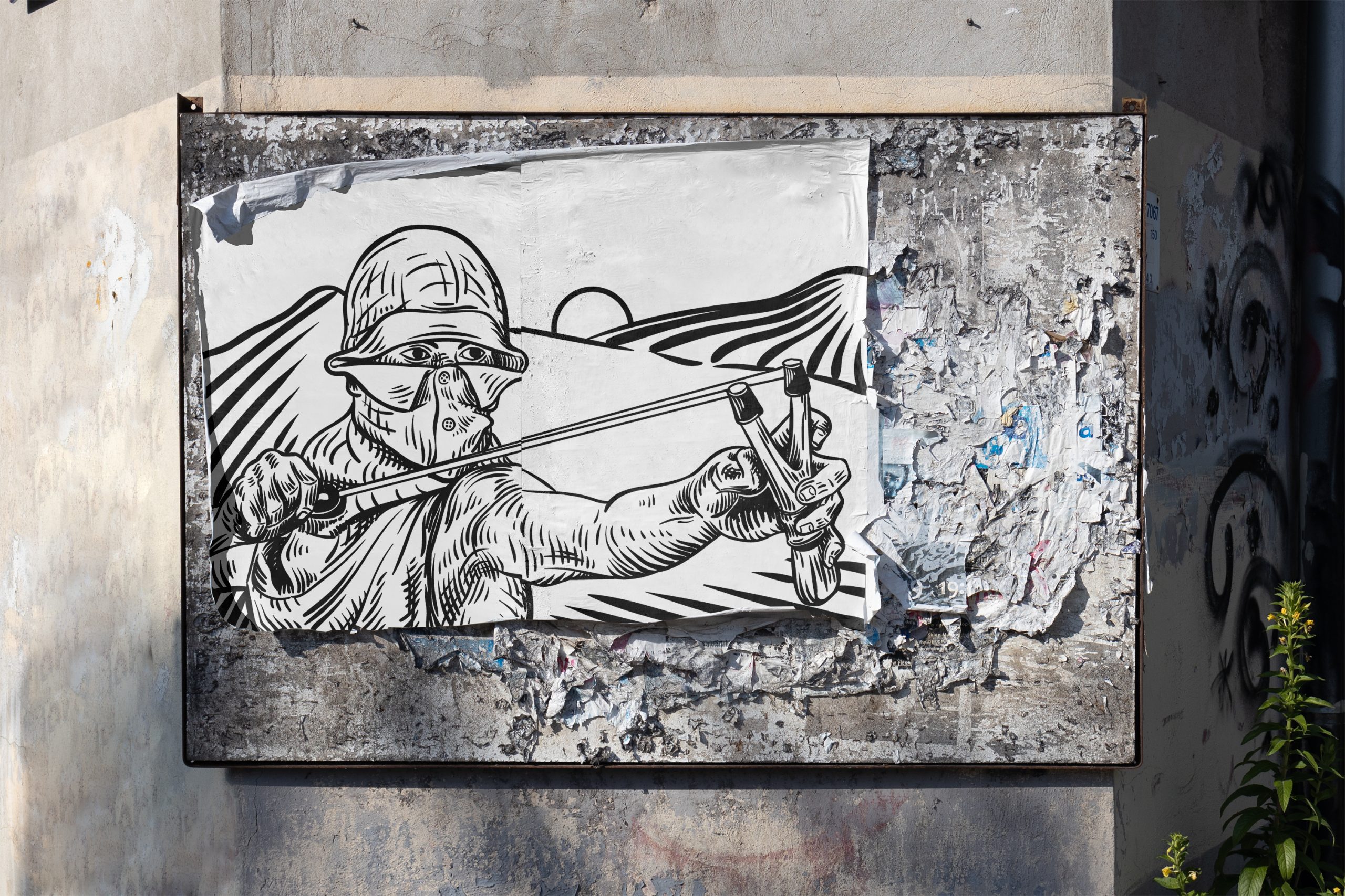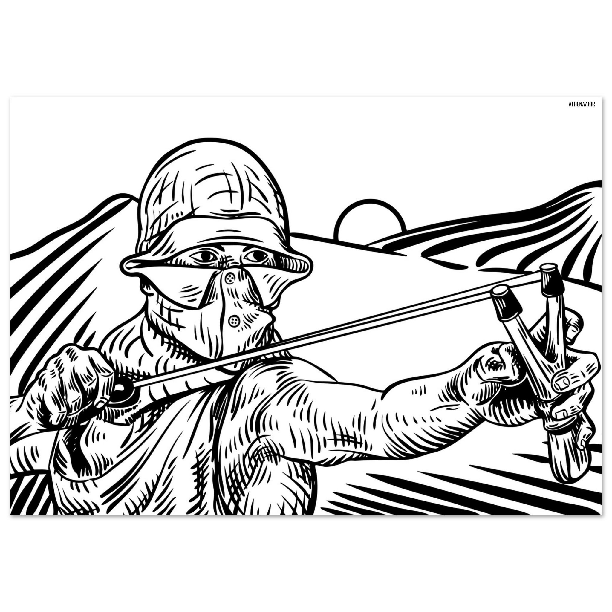 Illustrazione che presenta un ragazzo con il volto coperto da una camicia, che impugna una fionda carica e guarda verso l’orizzonte. Questo disegno serve a ricordare la lotta e la resistenza per la Palestina e si oppone fermamente alla guerra.