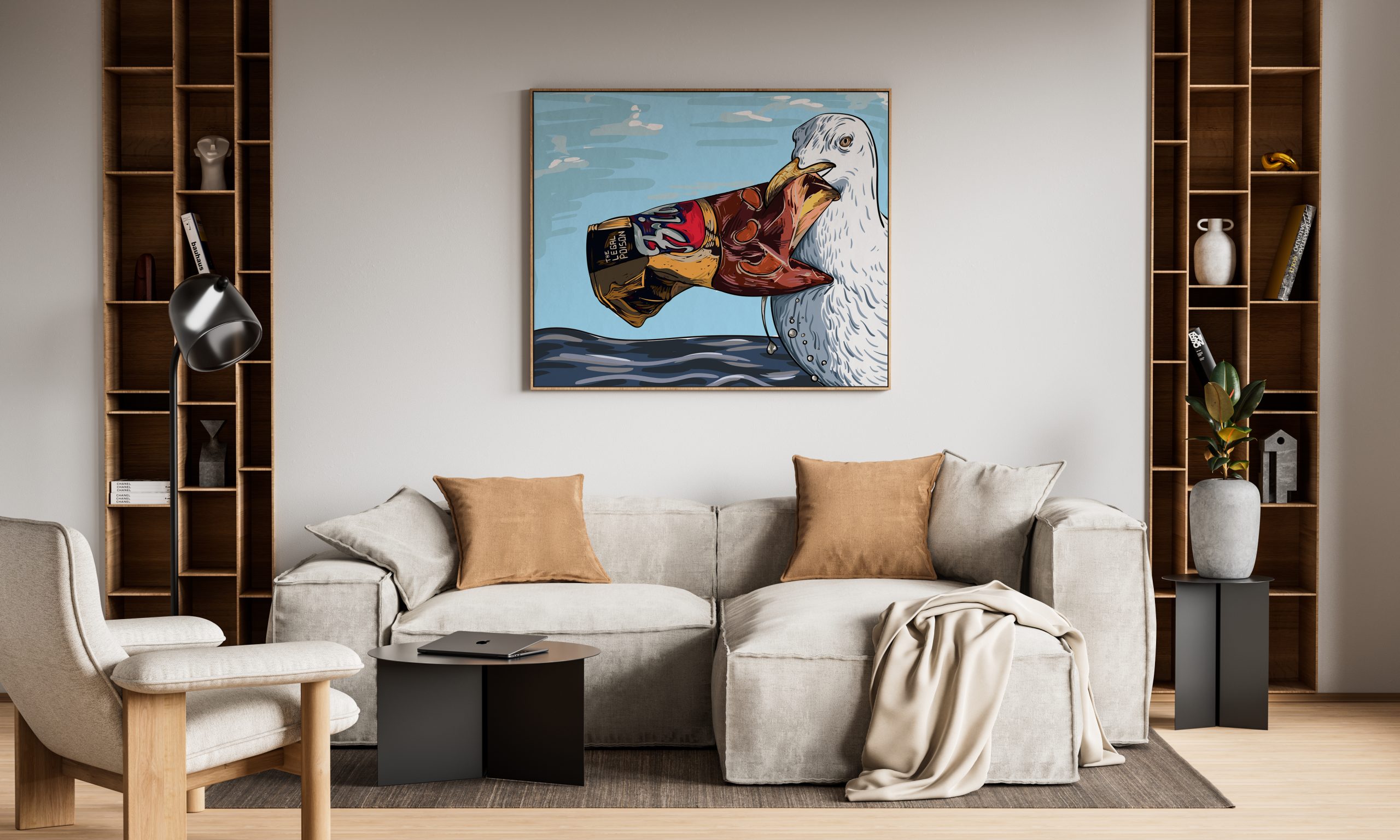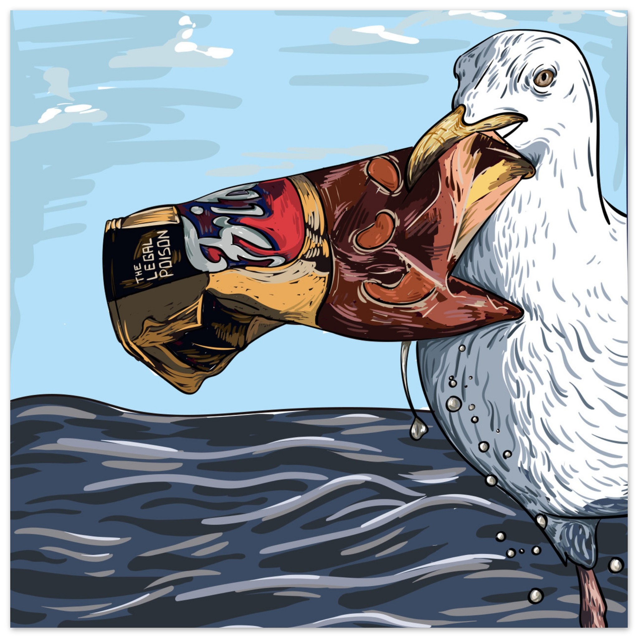 Poster che illustra un uccello che tiene nel becco un sacchetto di patatine, a simboleggiare l’impatto dell’inquinamento sugli habitat della fauna selvatica.