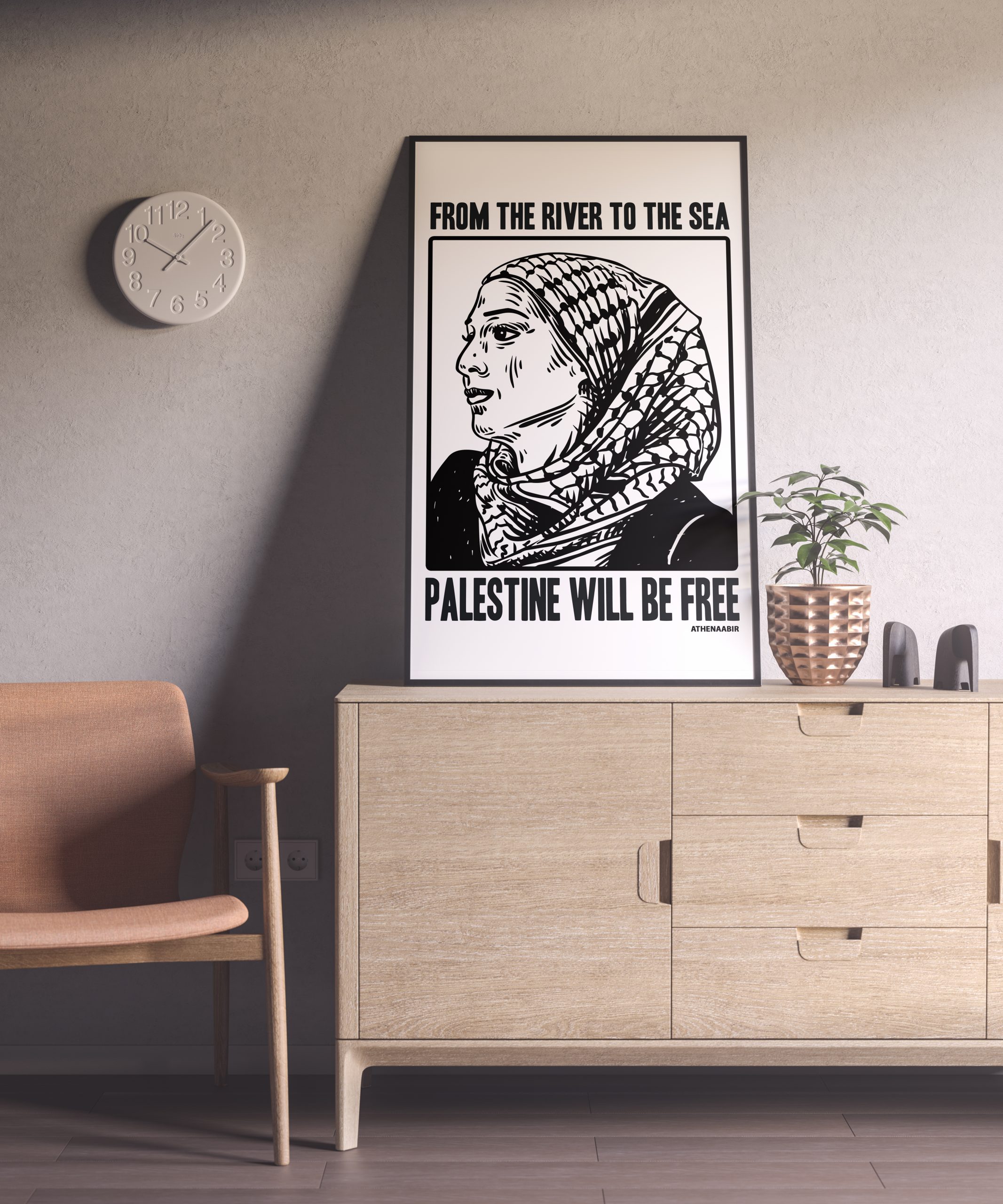 Esprimi il tuo supporto per il popolo palestinese con il mio poster “Madre Palestina”. Questa illustrazione celebra la resilienza delle donne, dei bambini, degli anziani, e degli uomini di Palestina.