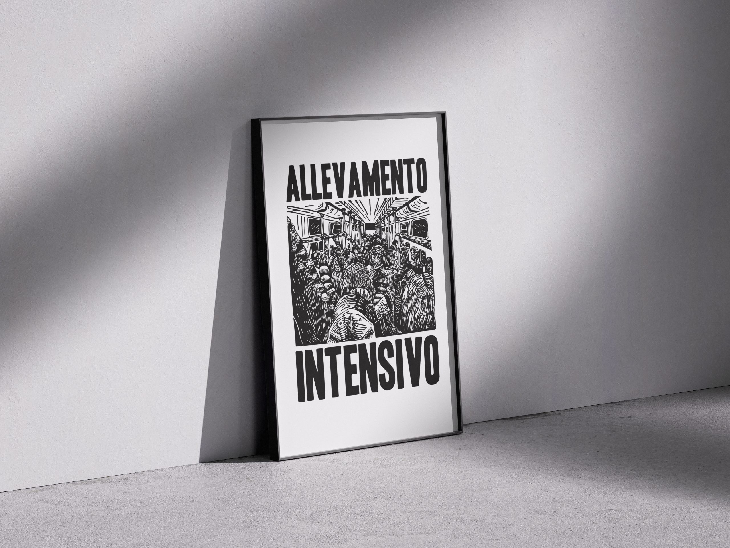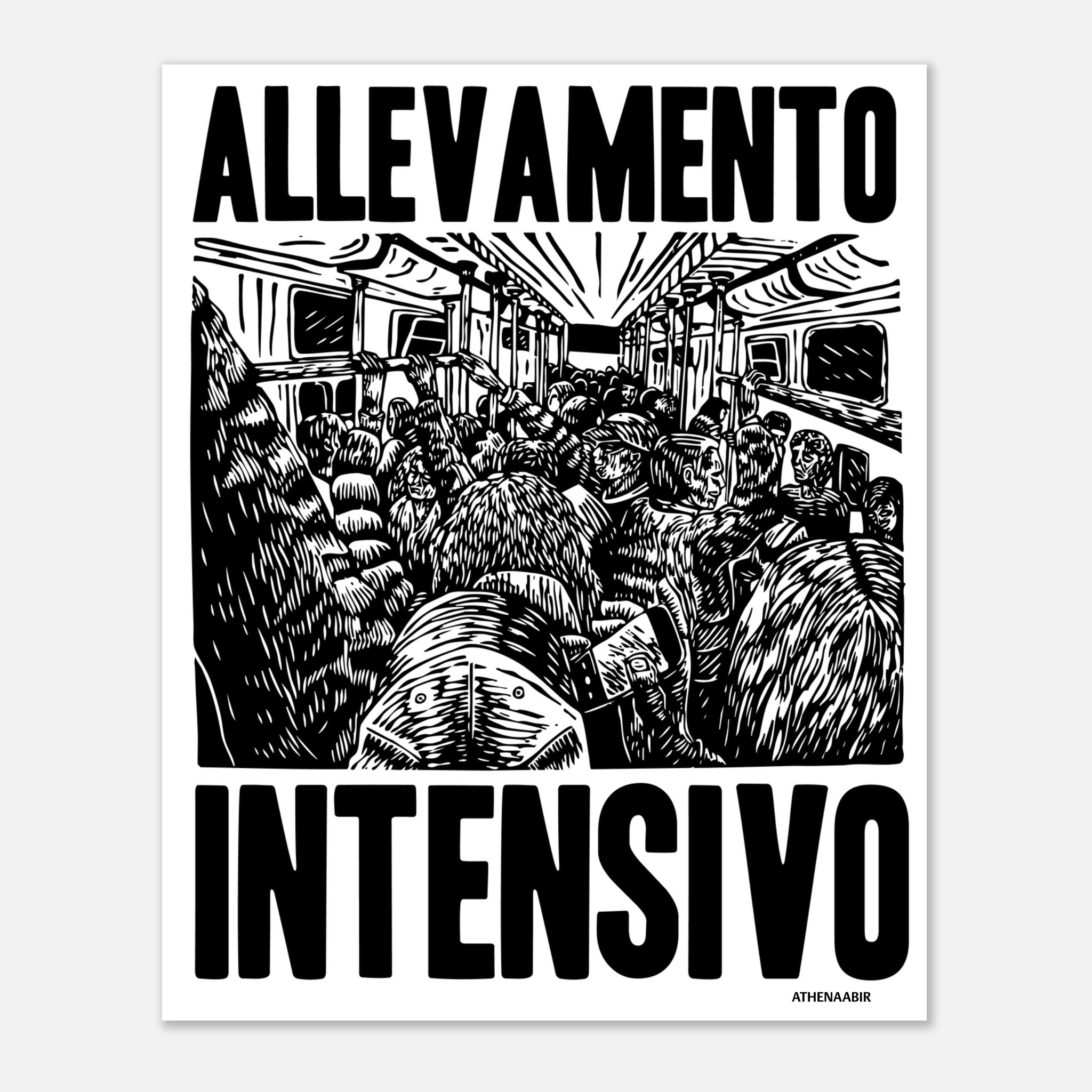 Incisione su legno. Questa stampa rapprensenta la forte correlazione che tra allevamenti intensivo e come gli uomini vivono la loro vita “programmata” come se fossero in un allevamento intensivo. L’uomo crede di dominare la natura, ma vive come le sue bestie, confinato, controllato e convinto che non esista un altrove