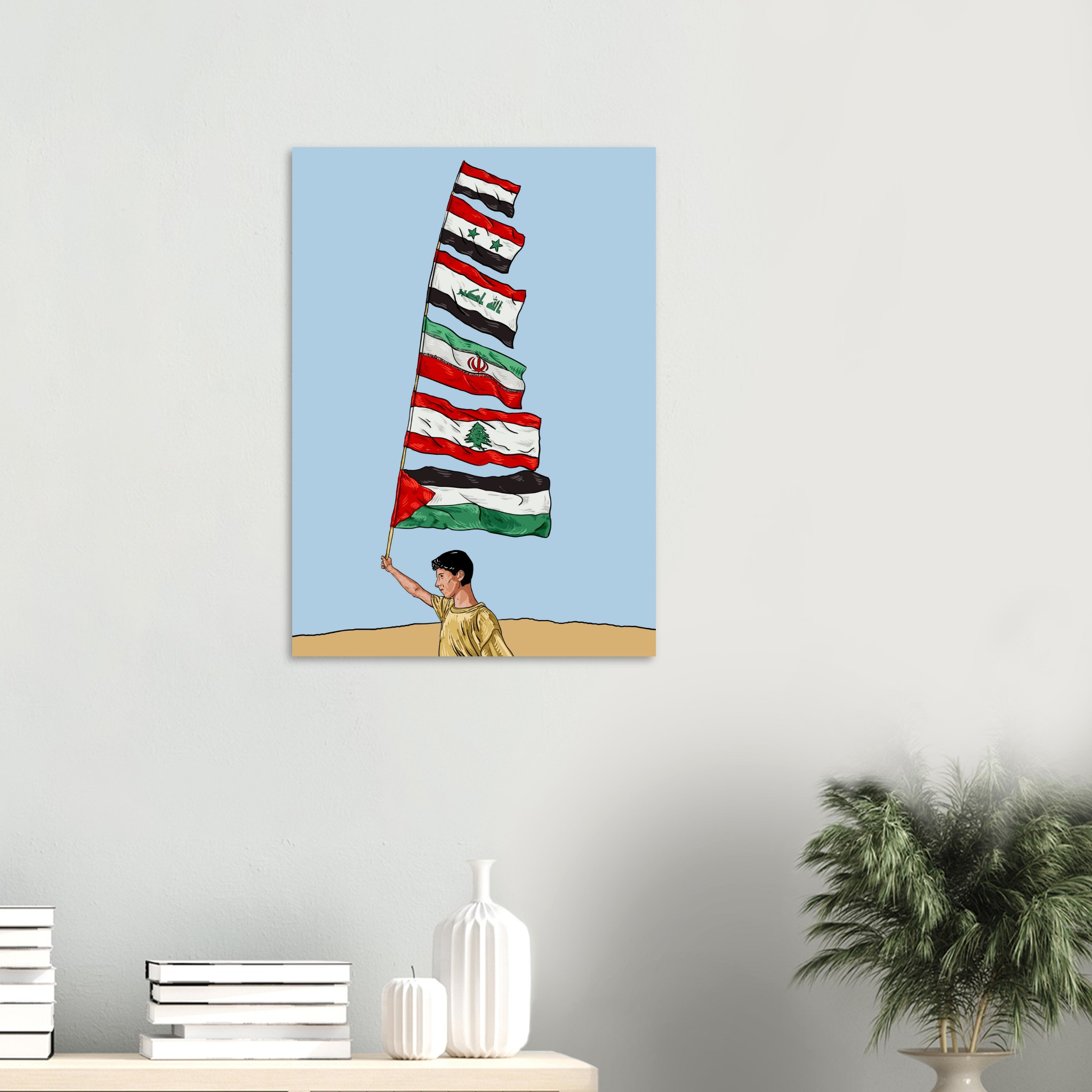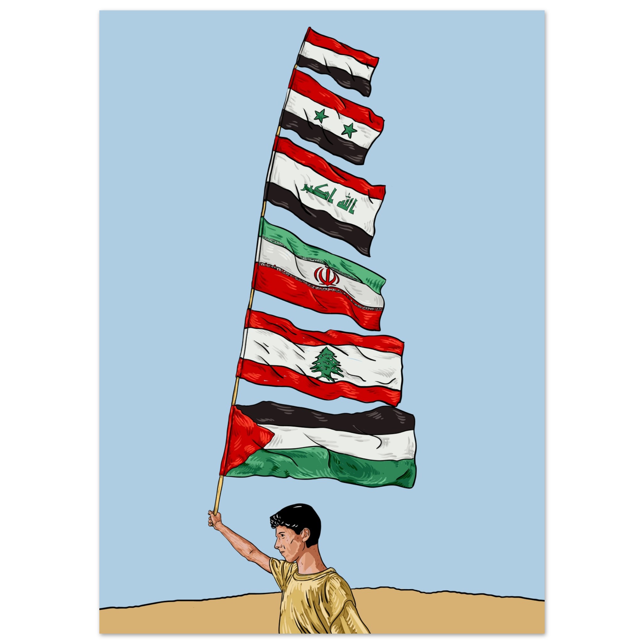 Questa illustrazione mostra un giovane che sventola diverse bandiere, evocando l’importanza della giustizia e della pace in alcune zone del mondo che ne hanno bisogno.