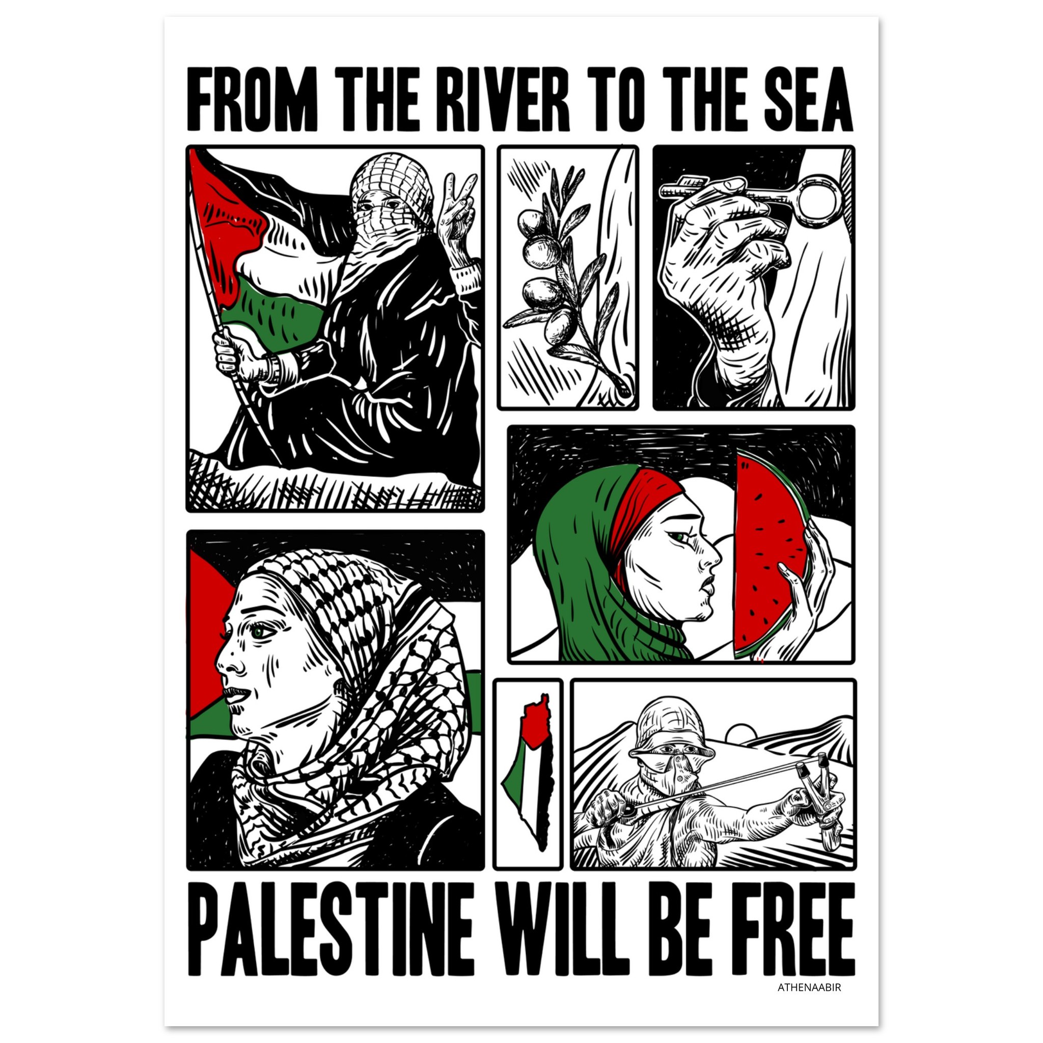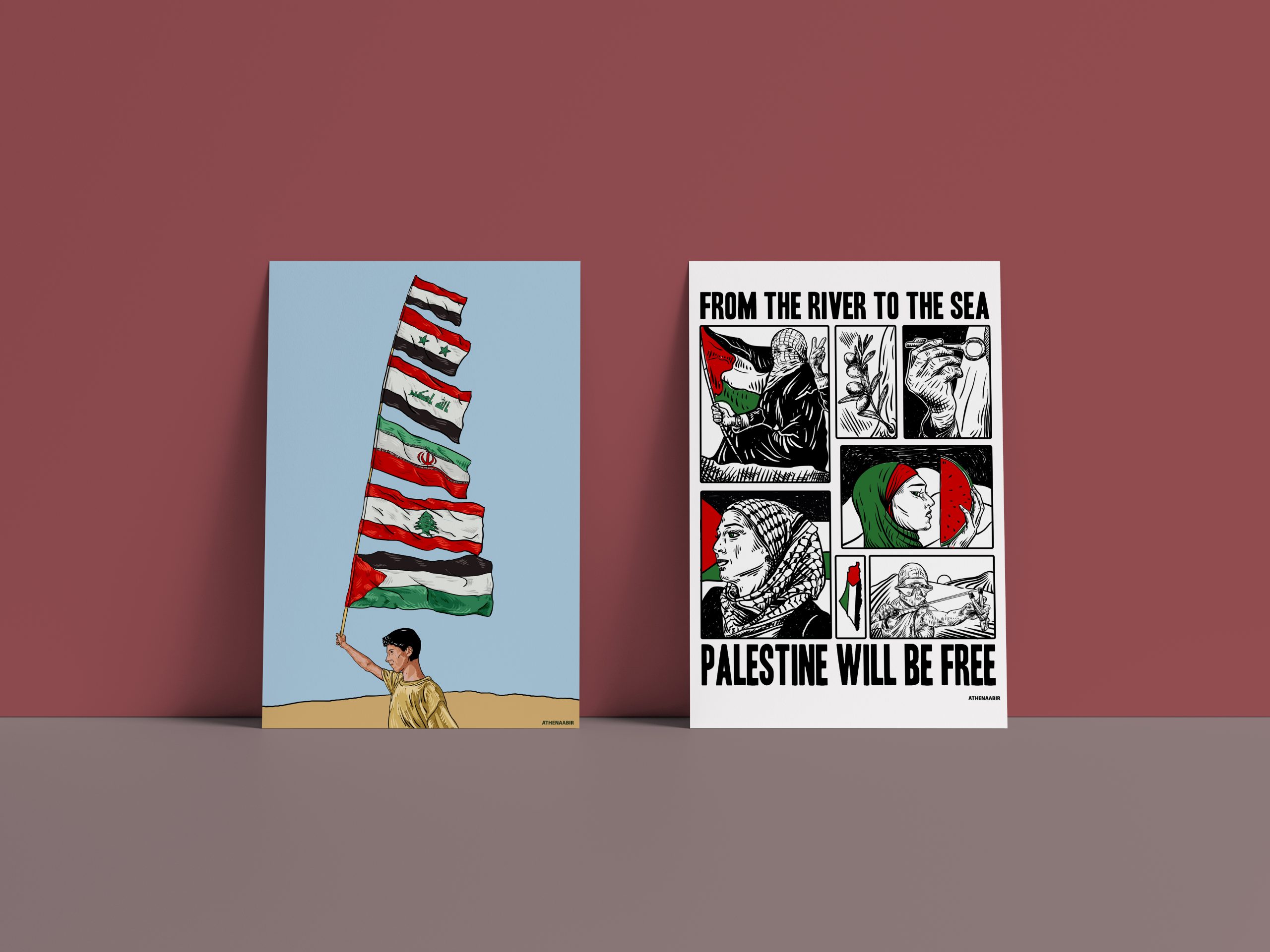 Questa illustrazione l’ho realizzata in supporto della Palestina. Rappresenta delle vignette con vari aspetti della cultura Palestinese, come per esempio la chiave del ritorno, l’ulivo o la fetta di anguria. In questo momento così tragico, è davvero importante dichiarare apertamente di supportare la Palestina.